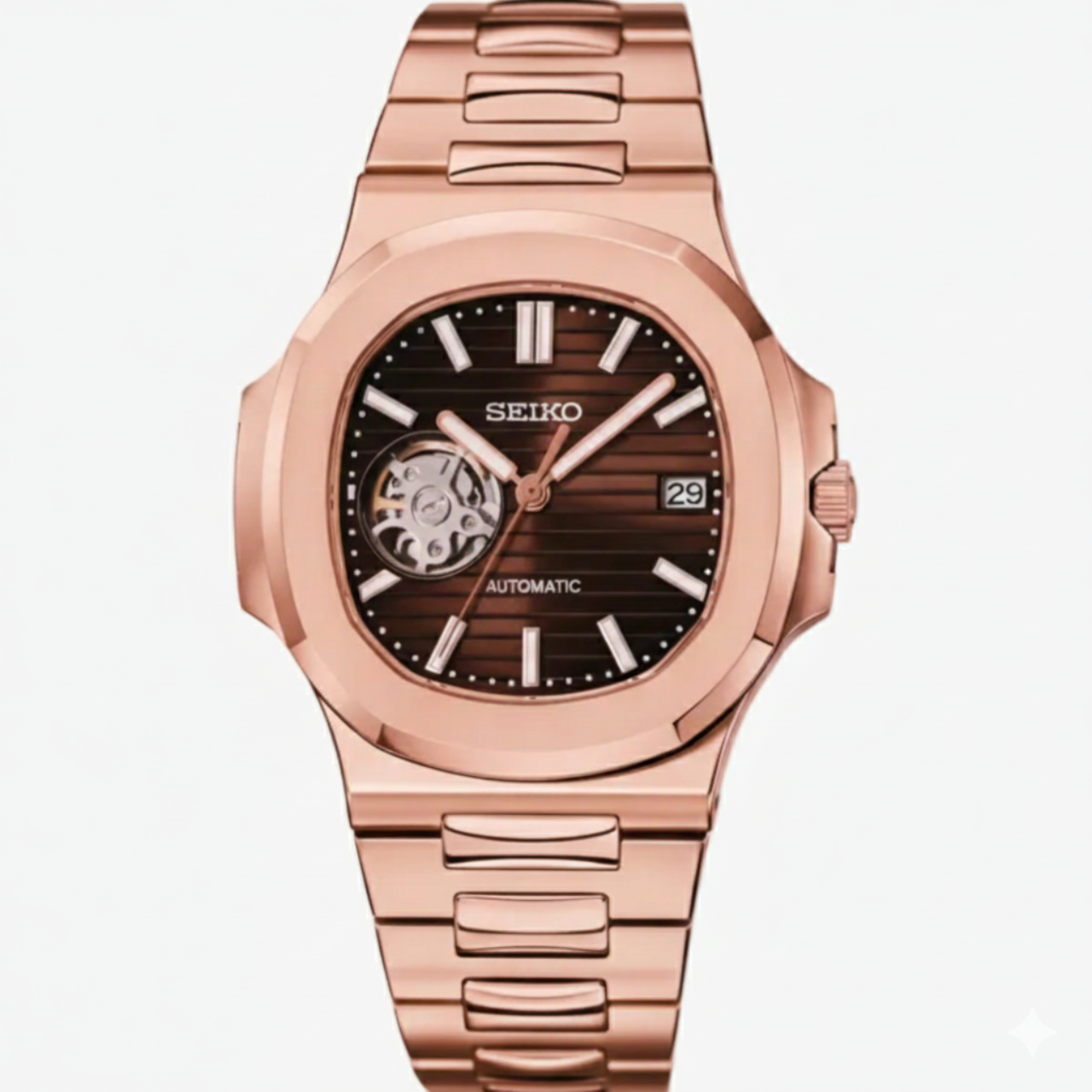 Inspirado en el icónico diseño del Nautilus y equipado con el confiable movimiento automático Seiko NH35, este reloj está ensamblado a mano para brindar precisión y estilo.