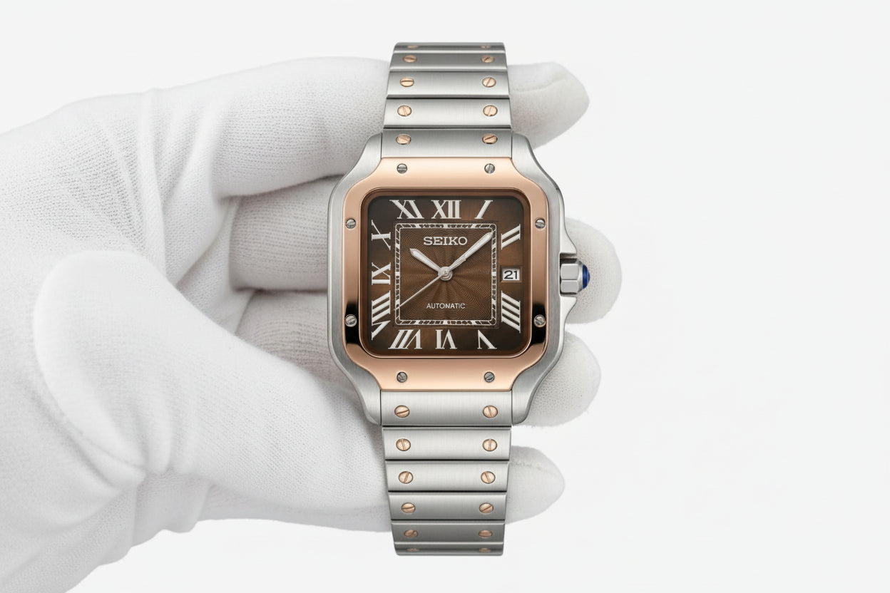 Inspirado en el icónico diseño de Santos y equipado con el confiable movimiento automático Seiko NH35, este reloj está ensamblado a mano para brindar precisión y estilo.